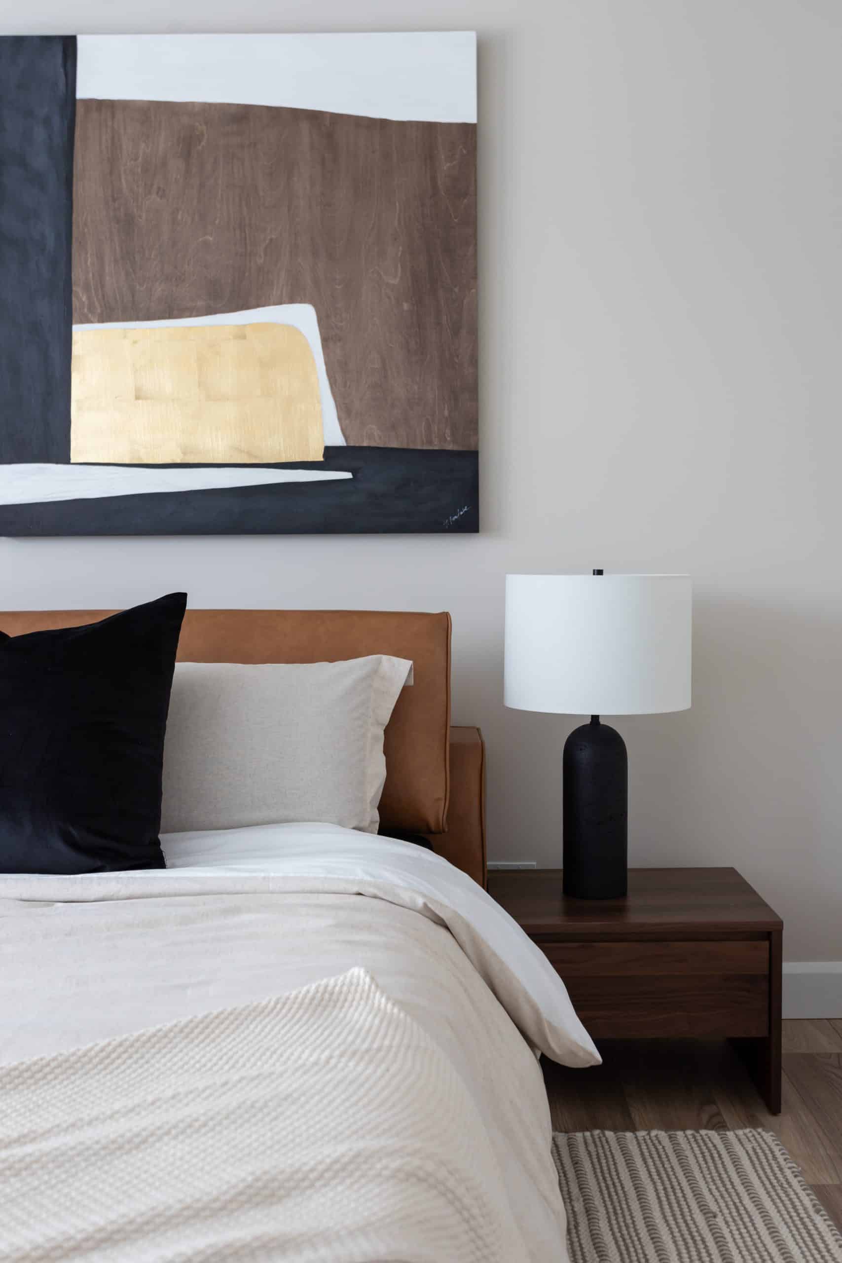Maison plain-pied préfabriquée de réalisation du modèle Courtoise de style Farmhouse. Vue du la chambre des maîtres.