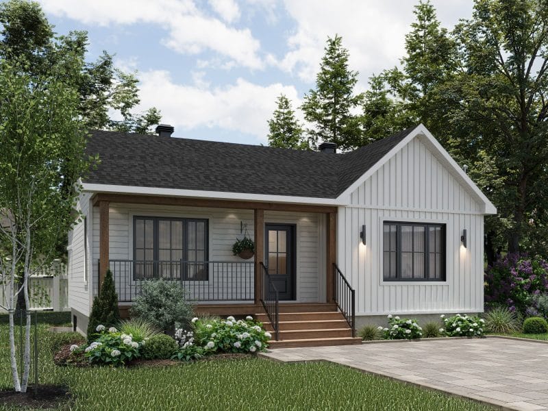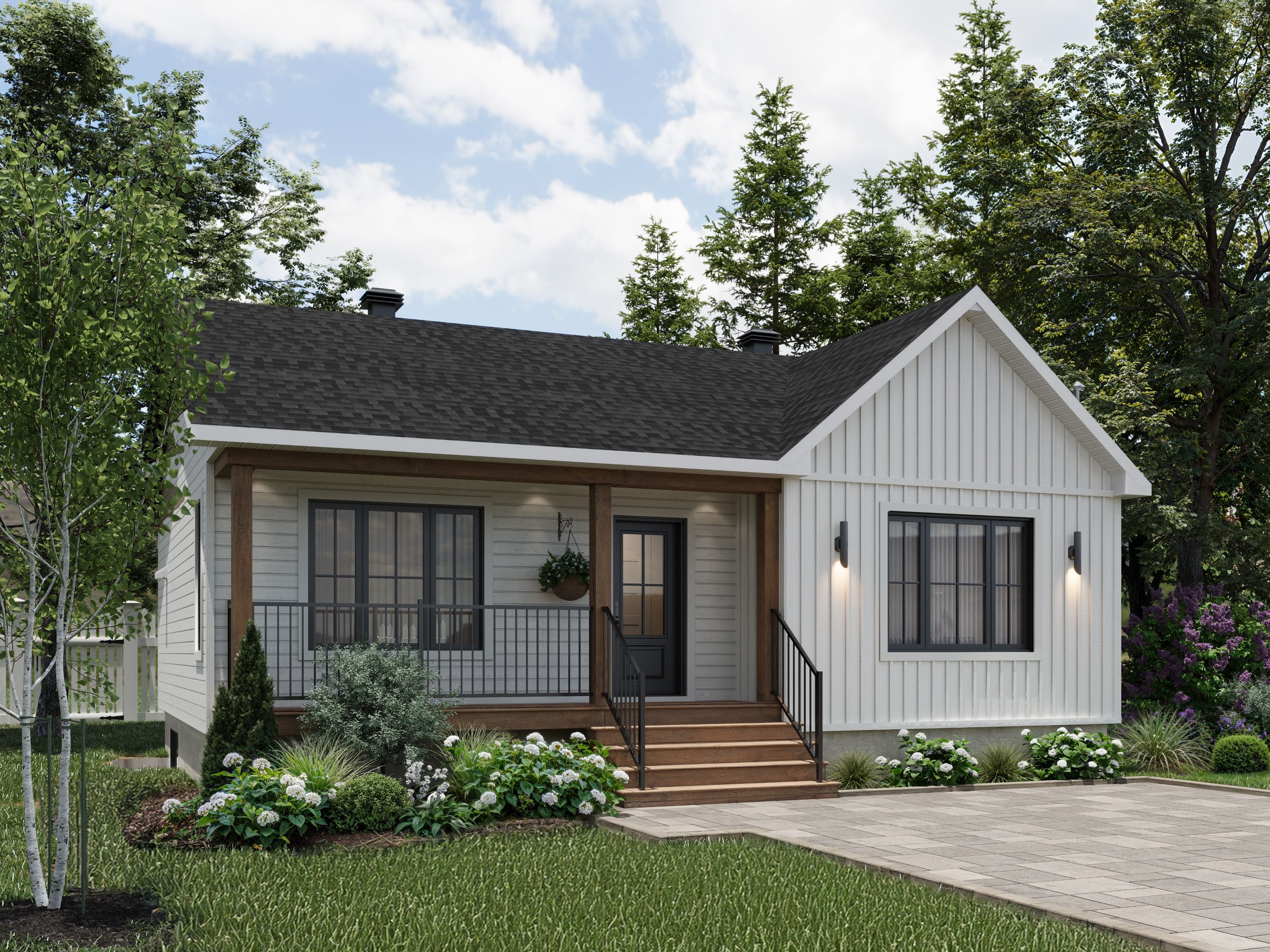 The Courtoise model is a bungalow in the Classic Farmhouse style. View from the outside.