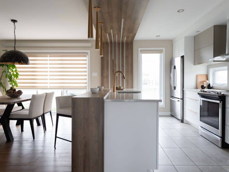 Once inside, the entrance is practical and functional, with a large walk‑in closet perfect for organizing coats and accessories. This hallway leads directly into a light‑filled living room, whose layout opens onto a convivial dining room and a remarkably functional kitchen. The huge central island invites you to sip a drink, with its large wood‑effect overhang and custom lighting. To the right of the kitchen is a walk‑in pantry, offering floor‑to‑ceiling storage.