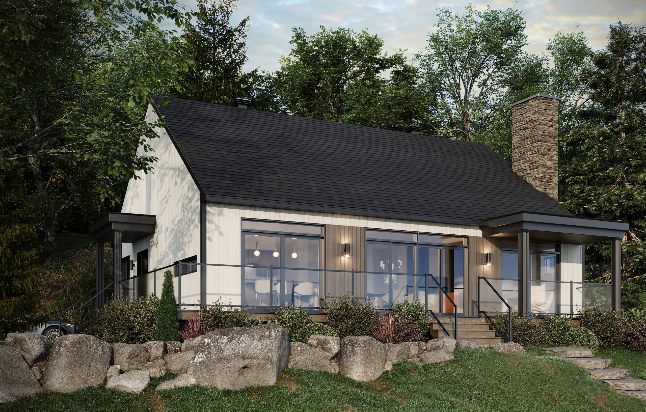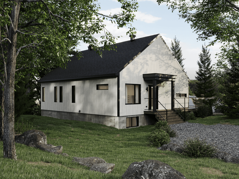 Modèle Alizé, un chalet de style moderne. Vu de la devanture extérieur arrière.