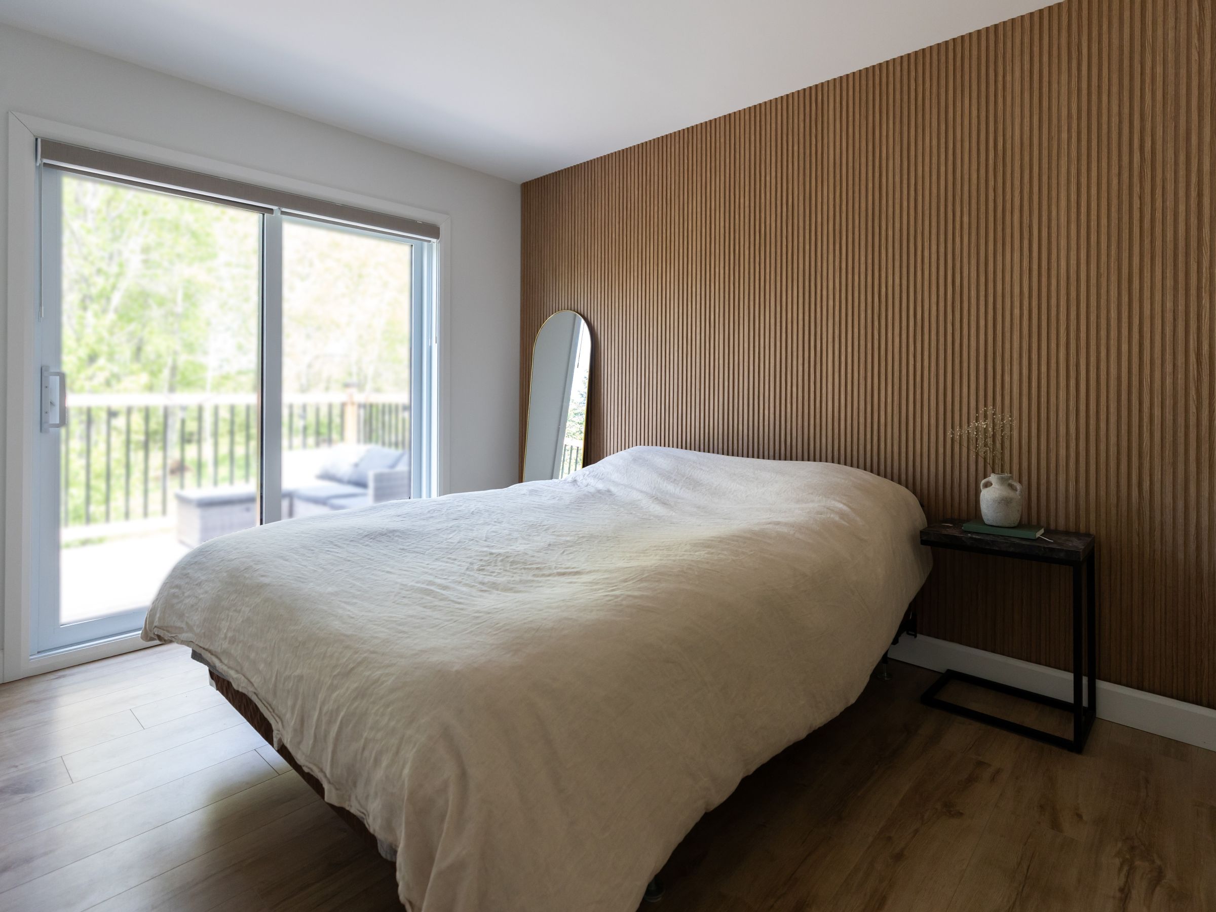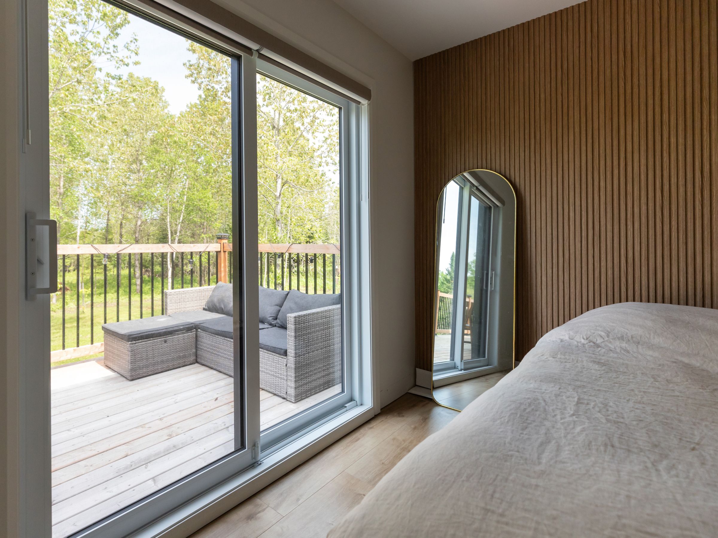 Une réalisation d'une maison préfabriquée appelée Merle. Cette réalisation client est de style Chalet contemporain, vu de la salle de bain.
