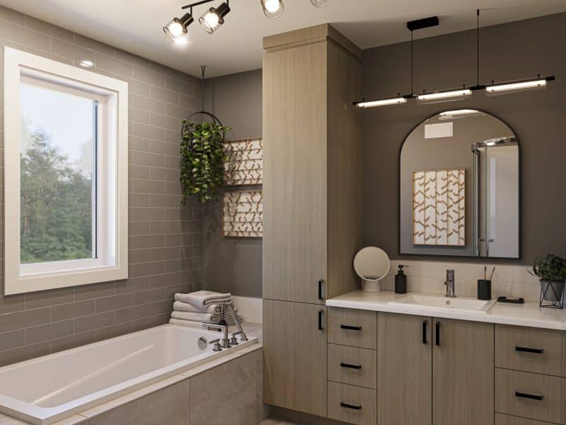 Ce plain‑pied contemporain inspiré du modèle Mignonne, sert à la perfection les besoins des clients. Le rendu est remarquable : une maison où confort, design et nature se rencontrent. Construisez la vôtre!