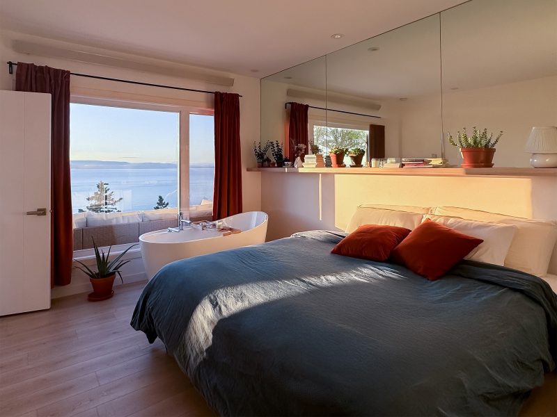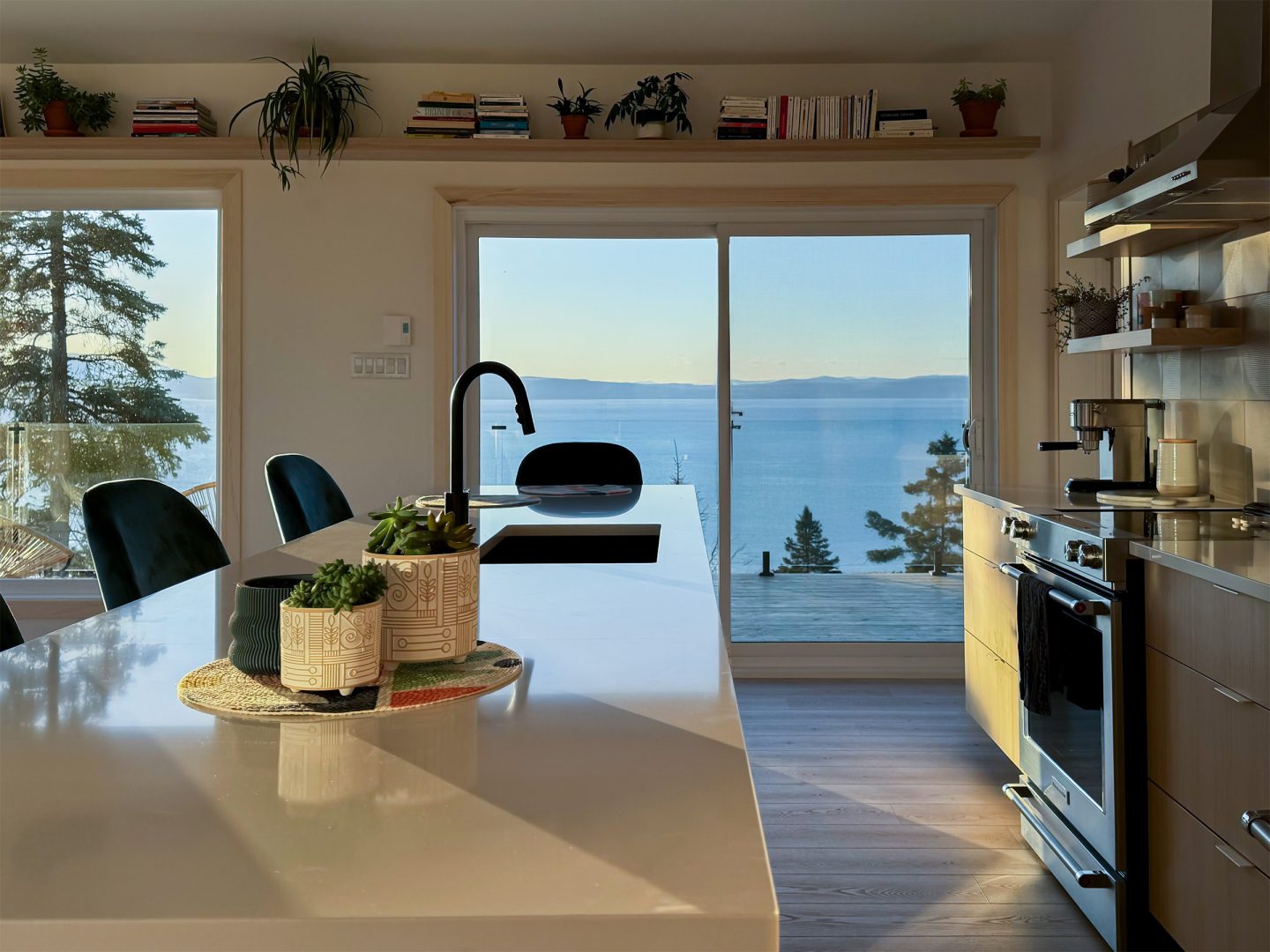 Dès l’entrée, la lumière inonde l’espace grâce aux fenêtres qui encadrent une vue imprenable sur l’eau. La cuisine, à la fois élégante et fonctionnelle, se distingue par ses armoires en bois clair, son dosseret en céramique aux motifs géométriques et son vaste îlot en quartz, parfait pour cuisiner et pour partager un moment convivial. Le foyer, dans un coin du séjour ajoute au cachet de la demeure. Chaque détail, du plancher en bois pâle aux finitions épurées, renforce cette impression d’harmonie et de connexion avec la nature.